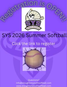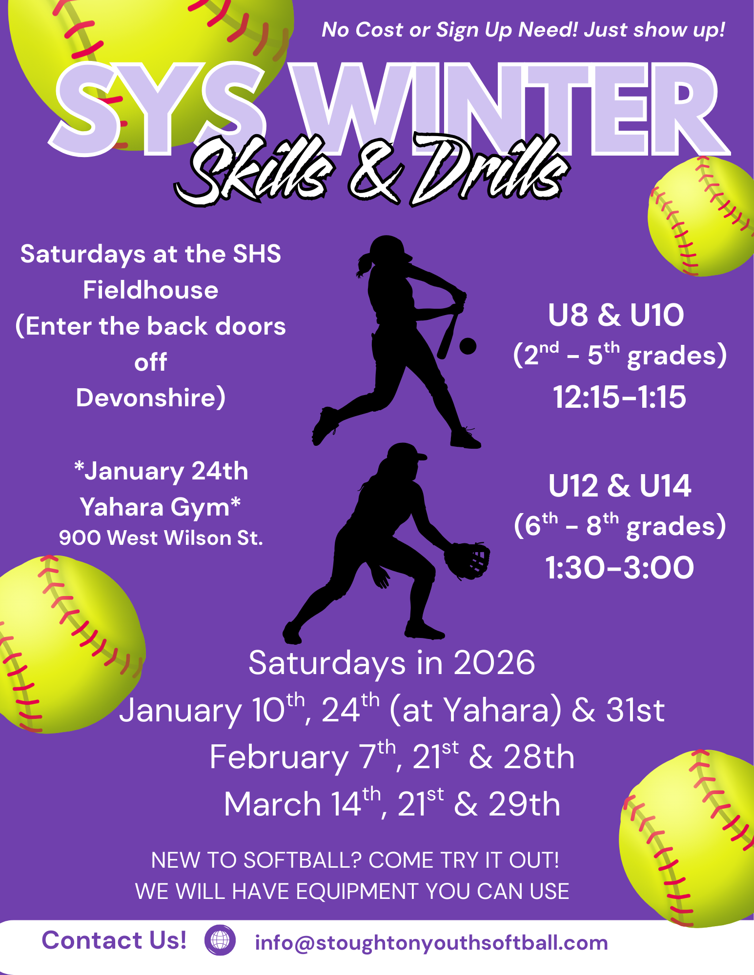 Stoughton Youth Softball League provides Stoughton area youth in Grades 1-9 with the opportunity to compete in softball leagues and to challenge them to perform to the best of their abilities. SYS provides league play for ASA Class B teams in support of improving the Stoughton High School softball program. Winter Skills and Drills run from January - March. Practices start in mid April and the season runs through the end of July.Contact Us