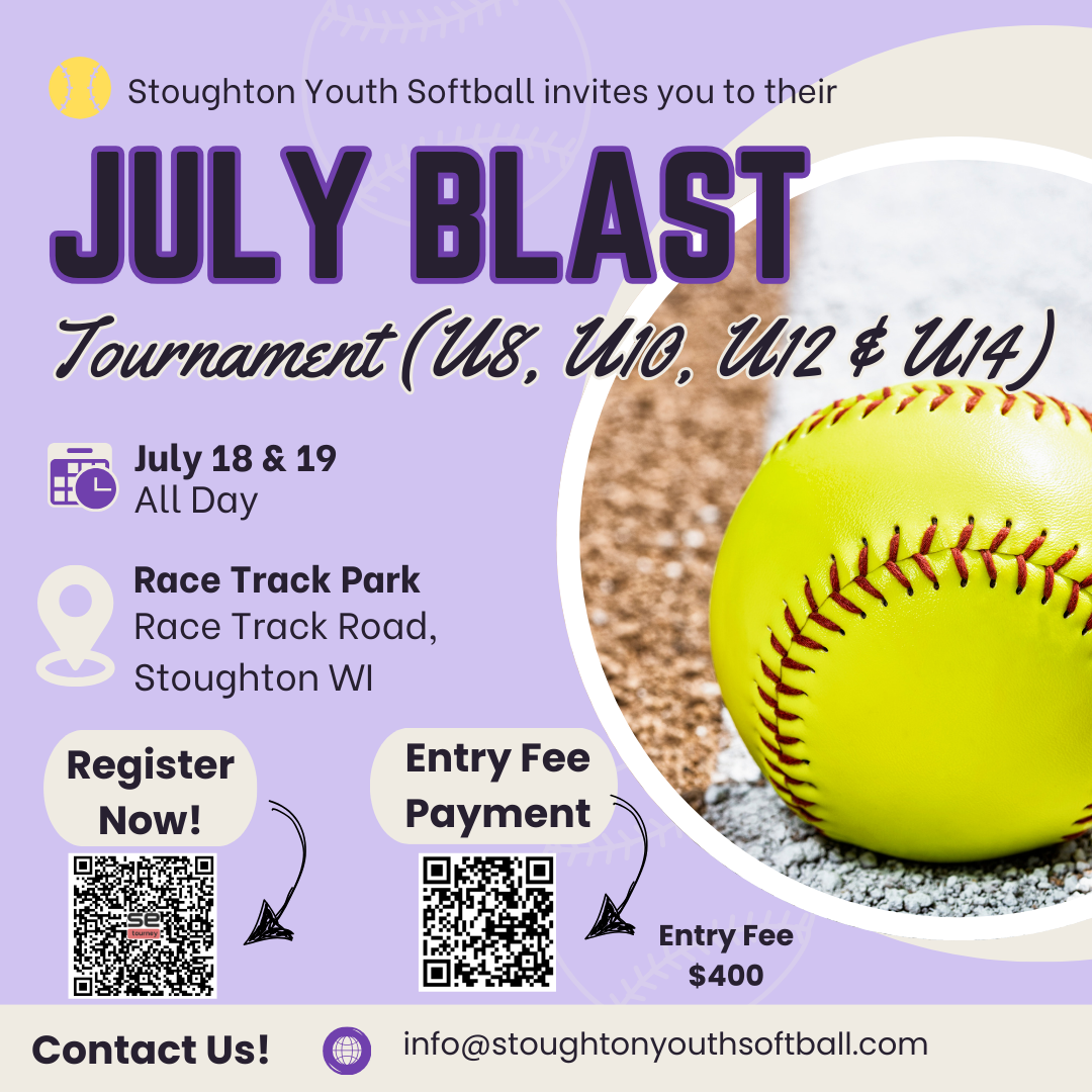 Tournaments JULY BLAST TOURNAMENT 2026 Additional Questions can be directed to info@StoughtonYouthSoftball.com Register Now Entry Fee Payment
